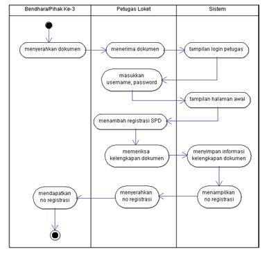 Petugas Loket menerima dokumen pengajuan SPD dari bendahara/pihak ke-3 untuk didaftarkan ke sistem, kemudian bendahara/pihak ke-3 akan mendapat no registrasi.