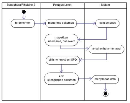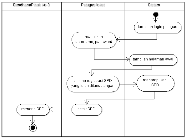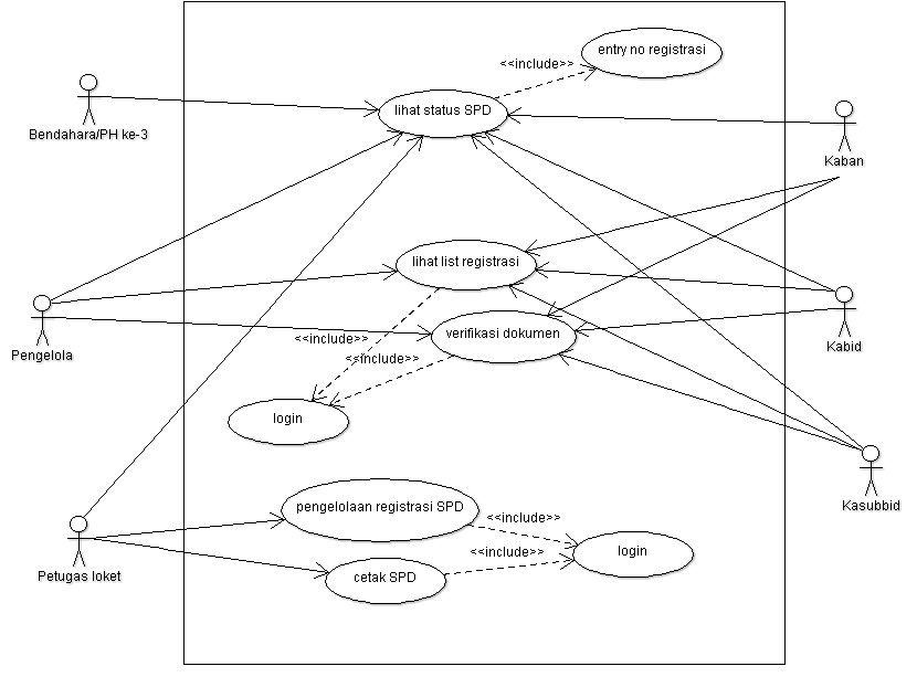 Pada proses SPD terdapat enam aktor yaitu, bendahara/pihak ke-3, petugas loket, pengelola, Kasubbid, Kabid, dan Kaban.