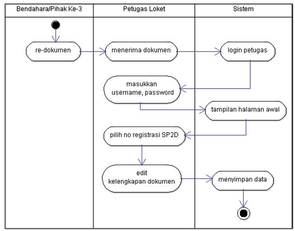 Petugas Loket menerima dokumen pengajuan SP2D dari bendahara/pihak ke-3 untuk didaftarkan ke sistem, kemudian bendahara/pihak ke-3 akan mendapat no registrasi.