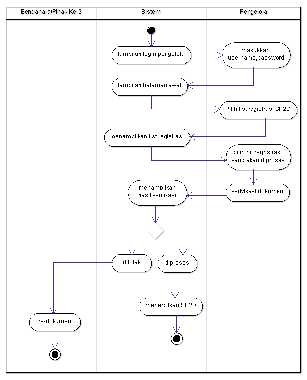 Pengelola melakukan proses verifikasi dokumen persyaratan pengajuan SP2D. Jika hasil verifikasi diterima maka proses selanjutnya adalah menerbitkan SP2D.