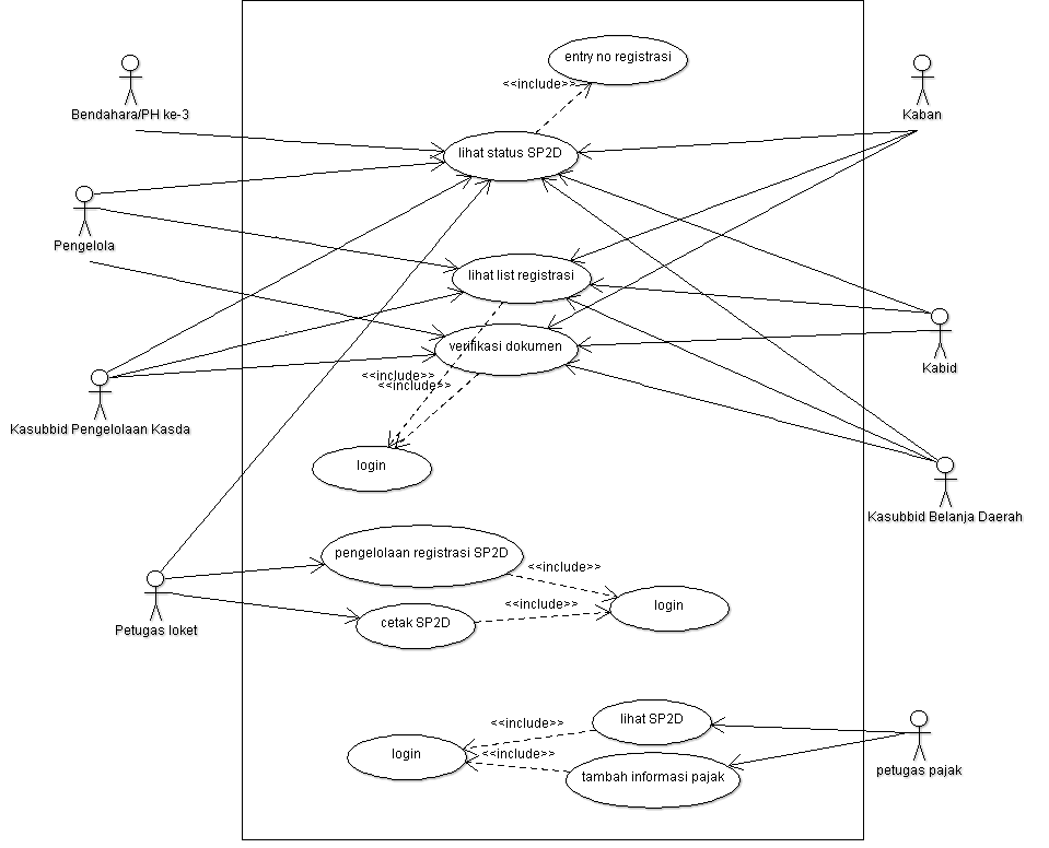 Pada proses SP2D terdapat delapan aktor yaitu, bendahara/pihak ke-3, petugas loket, pengelola, petugas pajak, Kasubbid Pengelolaan Kasda, Kasubbid Belanja Daerah, Kabid, Kaban.